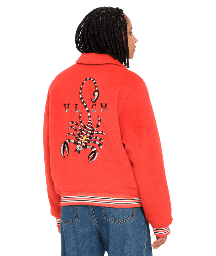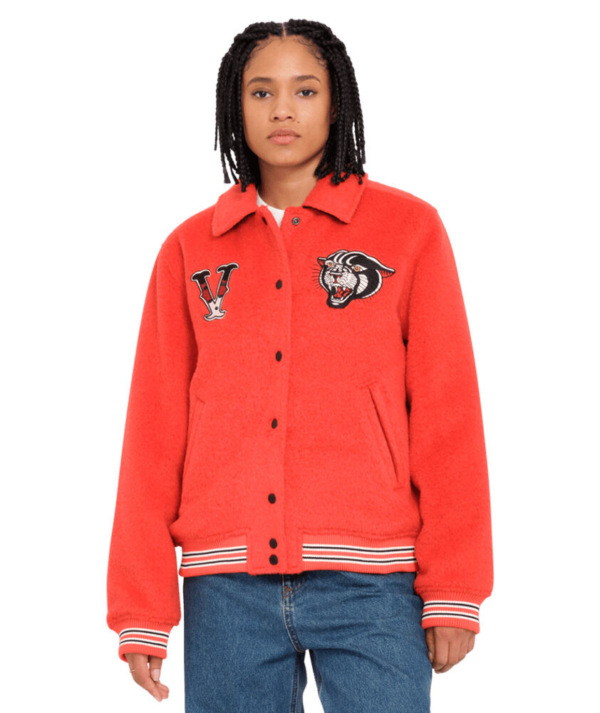 Dámská coach bunda Volcom v širším střihu s kontrastními úplety spodku a rukávů. Přední zapínání na patentky, boční kapsy, nášivky Volcom. Složení materiálu: 72% polyester, 28% vlna.