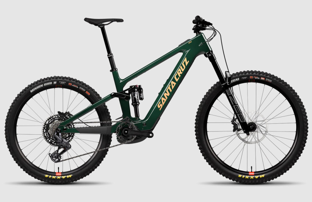 Elektrokolo Santa Cruz na celokarbonovém rámu s pohonem SRAM 70 Eagle. Vidlice: RockShox Zeb Base, 160mm. Tlumič: FOX Float X Performance, 205x60.