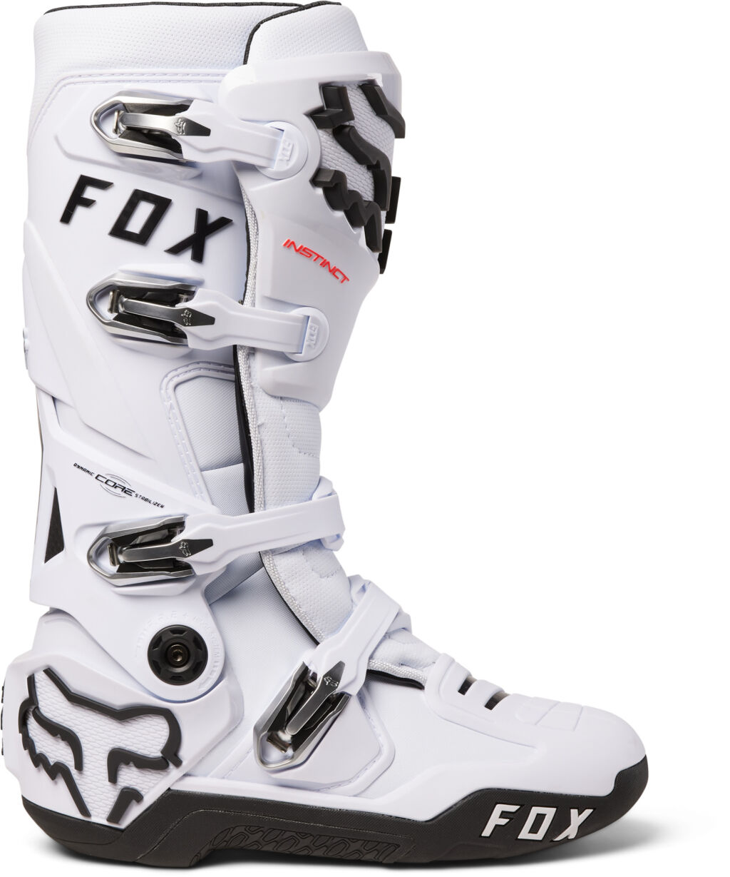Fox Instinct Core Boot jsou špičkové závodní motokrosové boty navržené pro maximální výkon, pohodlí a ochranu. Jejich konstrukce klade důraz na výjimečnou podporu kotníku a boční stabilitu, což zajišťuje bezpečnost i při náročné jízdě. Díky patentovanému kloubu boty zabraňují hyperextenzi a umožňují přirozený pohyb chodidla. Podrážka je vyrobena z odolné směsi Fox Duratac, která poskytuje vynikající přilnavost, tlumení vibrací a dlouhou životnost. Speciální systém odpružení v atletických vložkách připomíná běžecké boty, což výrazně zvyšuje komfort při chůzi i jízdě. Boty jsou vybaveny inovativními pivot přezkami, které se pohybují spolu s botou a zajišťují snadné a pevné zapínání. Nízký profil podrážky (Low Ride Chassis) umožňuje lepší kontakt s motorkou a přesnější ovládání brzd a řazení. Složení materiálu: 60% syntetická kůže, 30% TPU, 10% guma.