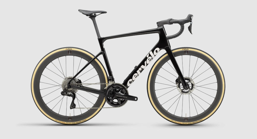 Celokarbonové závodní silniční kolo Cervélo. Vidlice: Cervélo All-Carbon, Tapered Caledonia-5 Fork; hlavové složení: FSA IS2 1-1/4 x 1-1/2; představec: Cervélo ST31 Carbon; řidítka: Cervélo HB13 Carbon, 31.8mm clamp; sedlovka: Cervélo SP24 Carbon; sedlo: Selle Italia NOVUS BOOST EVO SuperFlow Carbon; brzdy: Shimano Dura-Ace; kotouče: Shimano CL900 Centerlock; přesmykač: Shimano Dura Ace, R9250, 12 speed; přehazovačka: Shimano Dura Ace, R9250, 12 speed, Direct Mount; kazeta: Shimano Dura-Ace, 11-34, 12 Speed; řetěz: