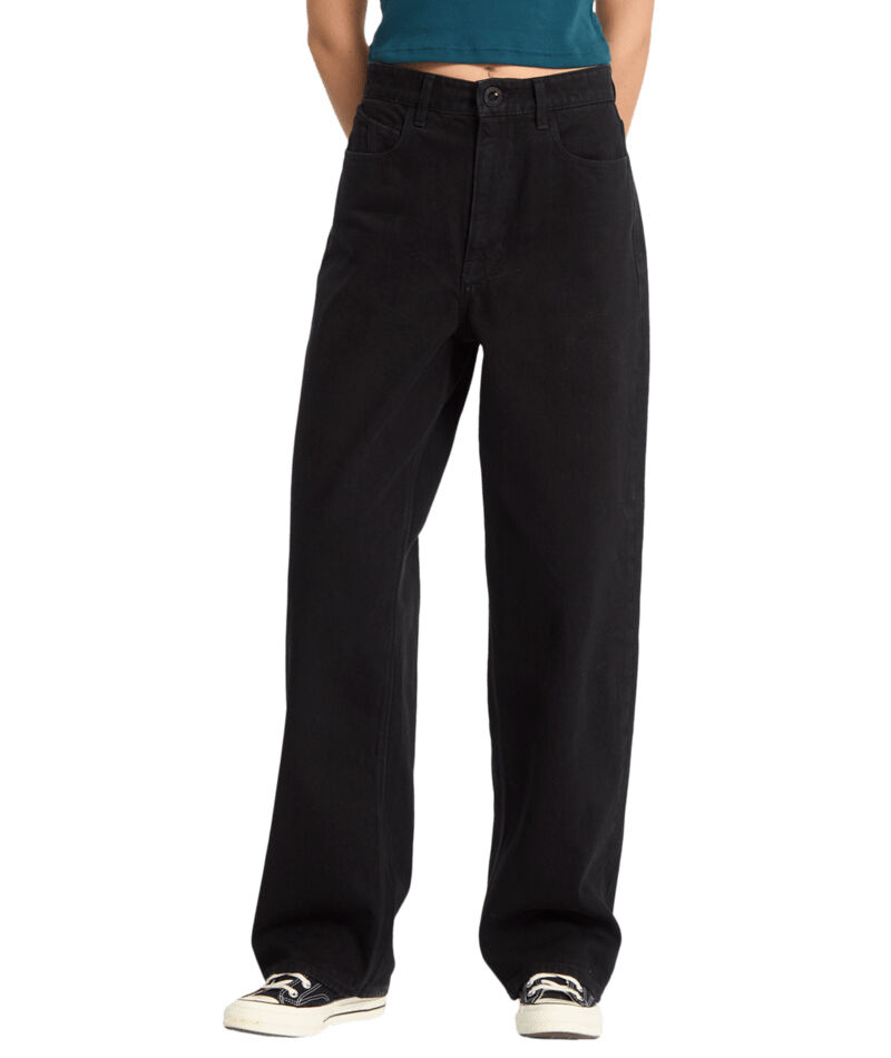 Dámské džíny Volcom mají volný střih a vysoký pas, což zajišťuje pohodlné nošení a moderní siluetu. Jsou navrženy v klasickém stylu s pěti kapsami a doplněny o charakteristické „V“ poutko uprostřed zadního pasu. Zapínání je řešeno kovovým knoflíkem s přezkou a kovovým zipem. Na zadní části se nachází denimový štítek, výšivka Volcom na pravé zadní kapse a výšivka Stone na levé zadní nohavici, které podtrhují značkový charakter kalhot. Ve velikosti 27 mají šířku nohavice 44 cm (17,5") a vnitřní délku 74 cm (29"). Složení materiálu: 100% bavlna.